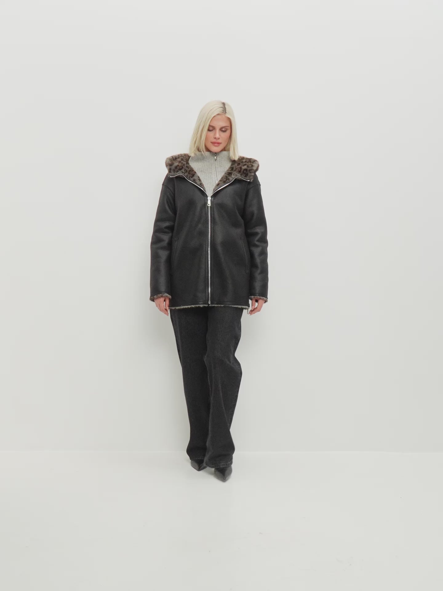 Elevate your outerwear collection with this stunning reversible faux leather jacket. Designed with a relaxed fit, this jacket features a cozy leopard-print faux fur trim on the hood and cuffs for added elegance and warmth. A full-length zipper adds functionality, while side zippers offer a customizable silhouette. The perfect blend of chic and cozy for colder days.
