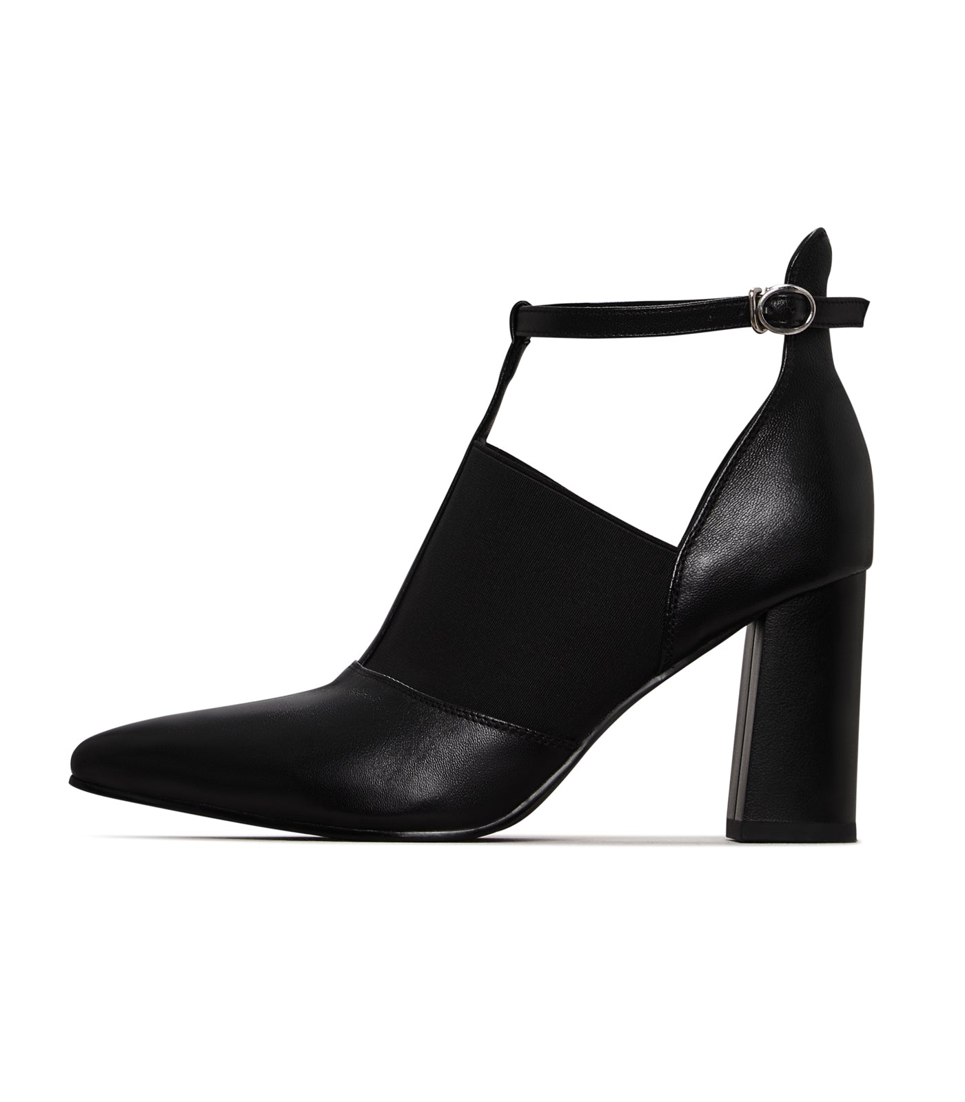 Redefine classic elegance with these modern T-strap block heels. Featuring a sleek pointed toe and a structured block heel, they offer both height and comfort. The combination of smooth leather and stretch fabric ensures a snug, supportive fit, while the delicate ankle strap adds a refined touch. Perfect for both workwear and evening ensembles, these heels bring effortless sophistication to any outfit.