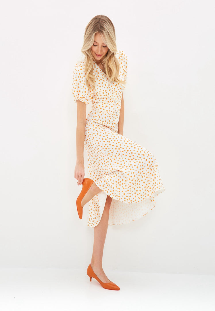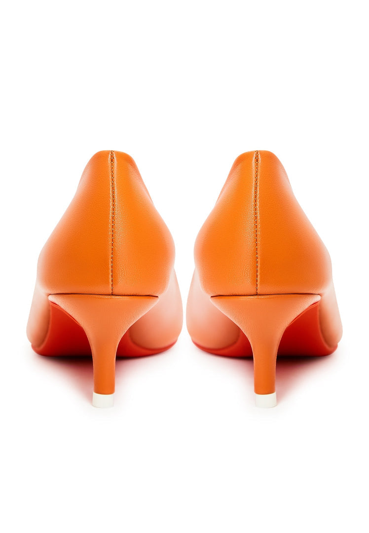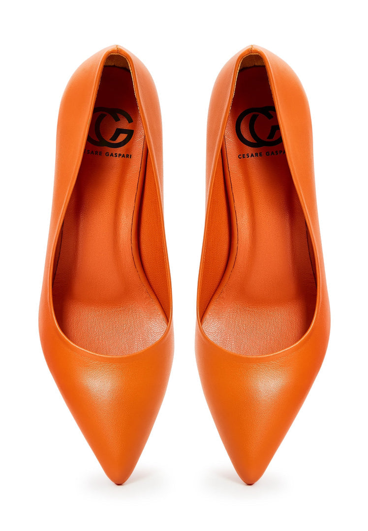 A pair of elegant orange designer pumps, high-end footwear showcasing luxury heels.
